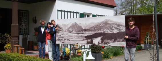 Unter dem Dach der Villa Jauss hing in dieser Zeit ein drei Meter langes historisches Oberstdorf Panorama von 1909, aus dem fotografischen Besitz des Königlich Bayerischen Hofphotographen J. Heimhuber (Sonthofen, Immenstadt, Oberstdorf). Und wir waren schon lange auf der Suche nach einem passenden Bild, das zu unserer überdachten Sitzecke im Vorgarten des historischen Geldernhaus passen könnte …
